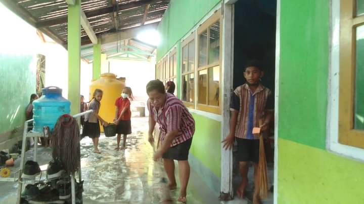 Siswa Sekolah Dasar Ipres Wolorona, Hokeng Jaya, Kab. Flores Timut-NTT pada hari ini, Kamis (17/10/2024) bersama para gurunya terpaksa harus bergotong royong membersihkan sekolahnya akibat kebanjiran.