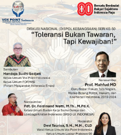 Berangkat dari kondisi ini, Vox Point Indonesia menggelar Diskusi Nasional Seri ke-50 bertema “Toleransi Bukan Tawaran, Tapi Kewajiban!”.