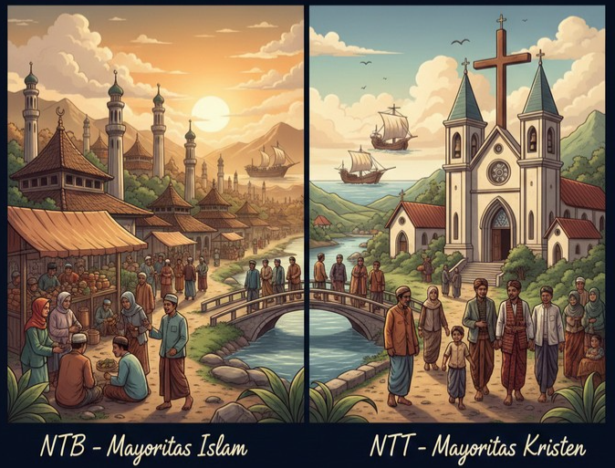 NTB dikenal sebagai wilayah dengan penduduk mayoritas Islam. Bahkan, daerah ini populer dengan sebutan Pulau Seribu Masjid karena kuatnya identitas keislaman yang tercermin dalam kehidupan sosial, budaya, hingga lanskap wilayahnya. Sebaliknya, NTT justru menjadi salah satu provinsi dengan populasi Kristen terbesar di Indonesia, baik Katolik maupun Protestan. Perbedaan mencolok ini tentu tidak hadir secara tiba-tiba, melainkan merupakan hasil dari proses sejarah panjang yang berlangsung selama berabad-abad.